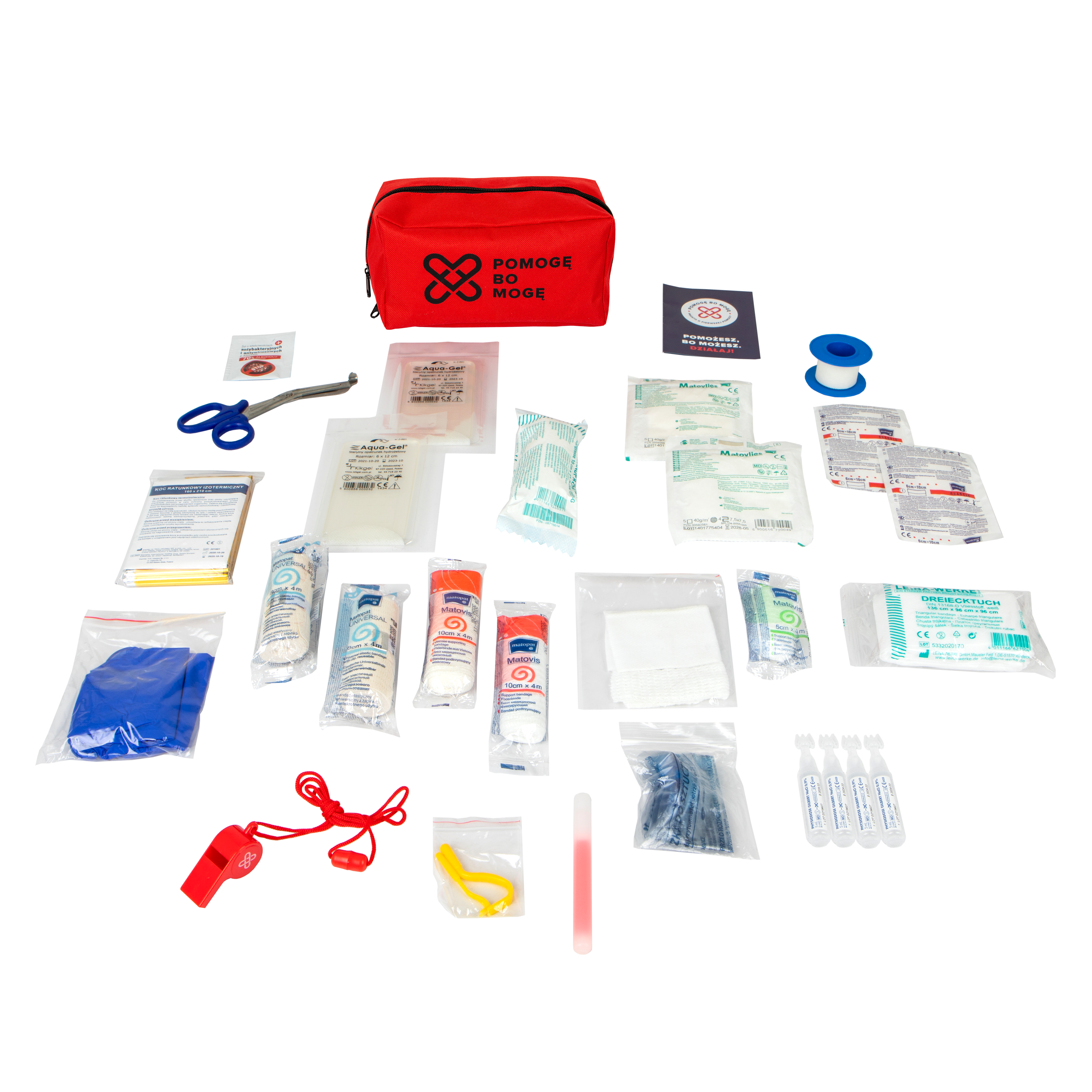 Dodatkowym wsparciem są produkty stanowiące wyposażenie każdej apteczki od Pomogę bo mogę, tj. roztwór NaCl 0,9%, Aquagel na wypadek oparzeń oraz wysokiej jakości nożyczki ratownicze, niezastąpione, gdy trzeba np. szybko rozciąć odzież, aby opatrzyć rany. W apteczce turystycznej dodatkowo znajdziesz opatrunek indywidualny typu G do tamowania ran mocno krwawiących, co może mieć niebagatelne znaczenie, gdy na pomoc medyczną trzeba poczekać dłużej niż w mieście.