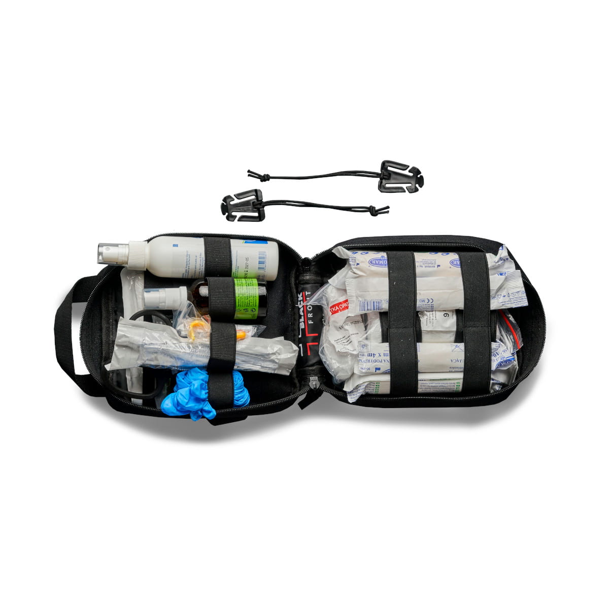 Z tyłu saszetki znajduje się zrywalny panel z systemem mocowania typu MOLLE, co pozwala na łatwe przyczepienie do innego ekwipunku przystosowanego do tego systemu. Z przodu natomiast umieszczone są tzw. laser cuty w systemie MOLLE, idealne do zamontowania najważniejszych akcesoriów, takich jak nożyczki czy opaska zaciskowa, przy użyciu dołączonych dwóch troków szybkiego montażu. Saszetka jest również wyposażona w gumową plakietkę z krzyżem, który stanowi międzynarodowy symbol apteczek.