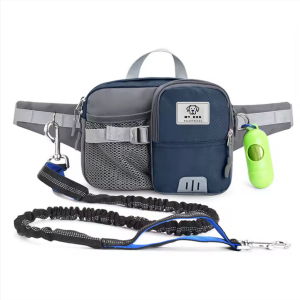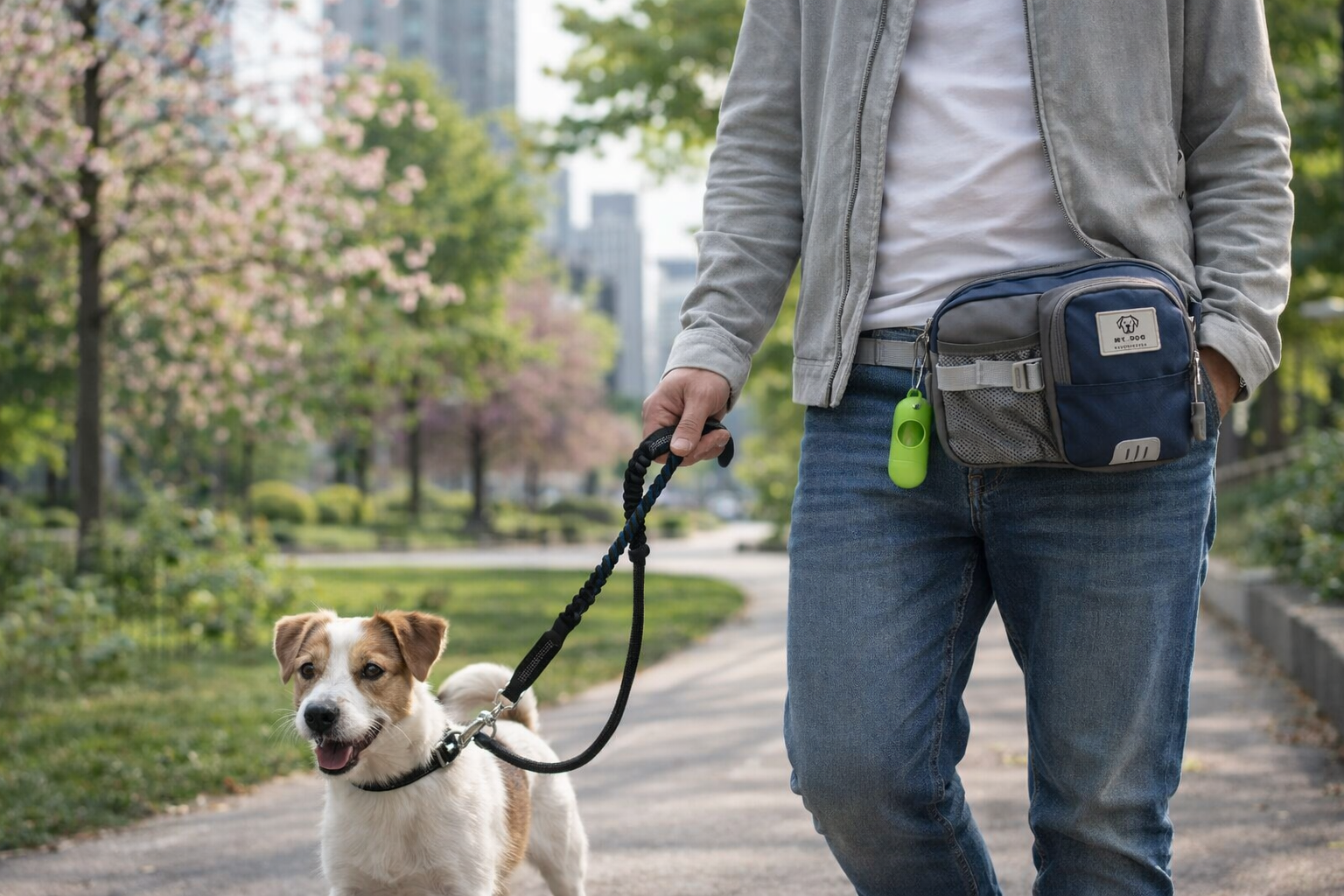 Akcesoria spacerowe w zestawie – smycz amortyzowana + pojemnik na worki.