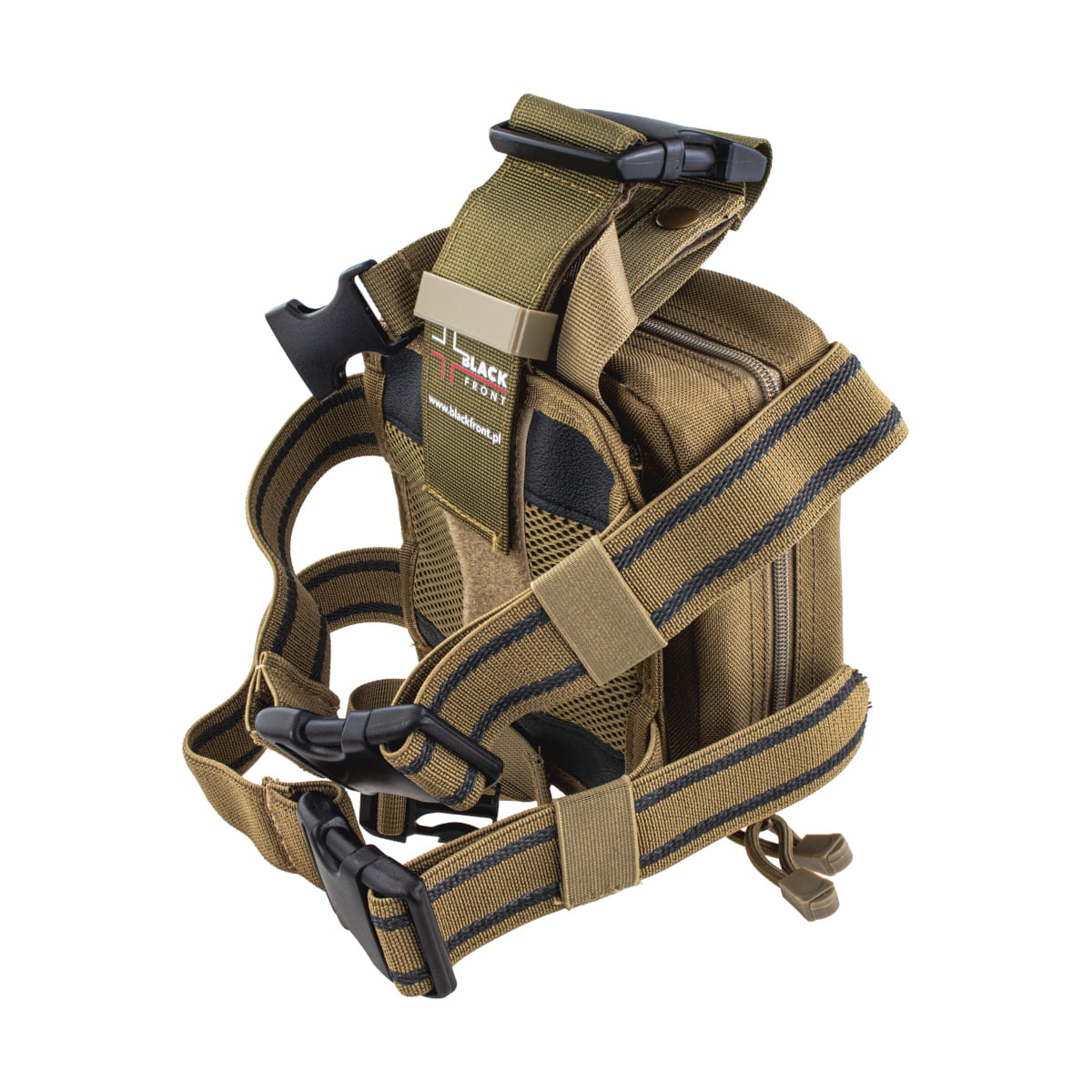 Po zewnętrznej stronie panelu znajduje się obszar pokryty rzepem, do którego przyklejana jest saszetka PTR. Dla dodatkowego zabezpieczenia saszetki mamy do dyspozycji jeszcze jeden pasek odpinany na klamrę. Takie mocowanie sprawia, że zamocowana apteczka nie odczepi się nawet w trakcie intensywnego ruchu czy zahaczenia o przypadkowe obiekty.